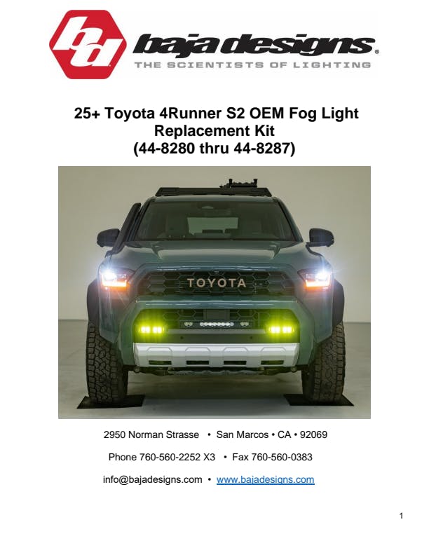 The Baja Designs S2 SAE Fog Light replacement Kit for the 2025 Toyota 4Runner (Non-TRD Pro) has been designed to light up the road and trail to differentiate your vehicle from the pack. This kit includes our next generation S2 SAE road legal fog lights designed to meet SAE J583 fog lamp requirements, allowing for a highly controlled light pattern with a sharp cutoff. It’s this cutoff that makes this kit an ideal choice for driving through dust, fog, and inclement weather, on road or off the beaten path.